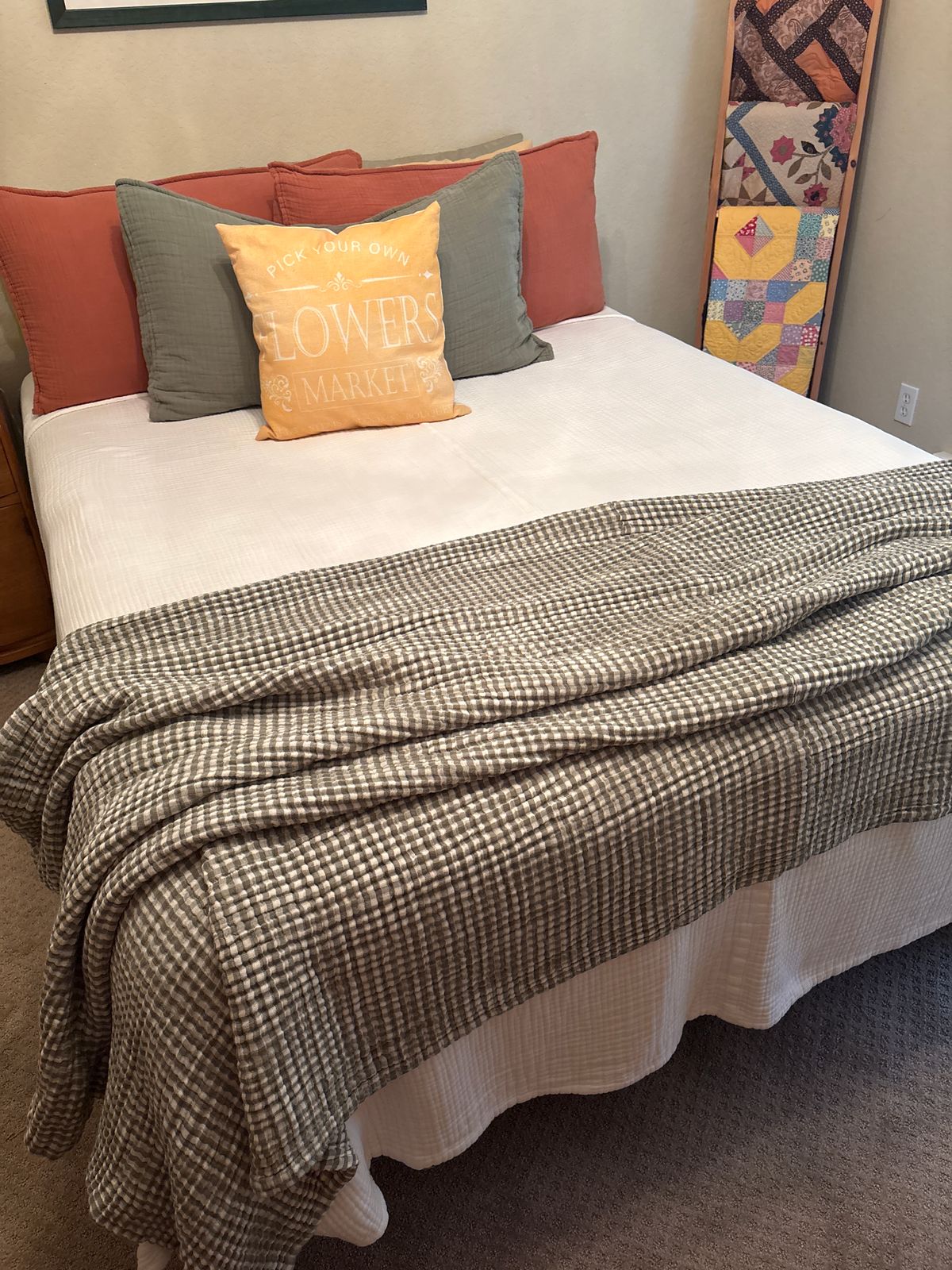 I got this one to add to the end of the bed as an accent color. I like it best with undyed, but it also looks good with raw sugar. It’s okay with the white, but the second color in it is warmer. I am on the fence with sage, I think it’s just not enough contrast for me, but the color is close enough that is doesn’t clash. (Yes, I have all these other colors, and then some 🥴). Price was too good to pass up!! It feels different than all the others, it’s fluffier. I haven’t actually snuggled up under it, but I am sure it’s just as great!! Also, I ordered the twin, but have it on a queen bed and it is long enough and would work great to pull up as a second layer if cold.